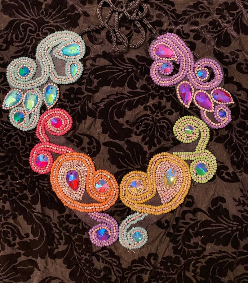 It was made using the swirly belt technique base, and your beautiful designs. Then I hand beaded, seed beads( large size 6) rhinestone chain and colored flat back crystals. For the belt I added beaded tassels. For the collar, I mounted it on felt with a tie.